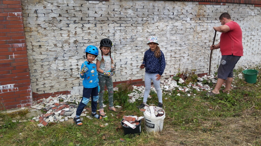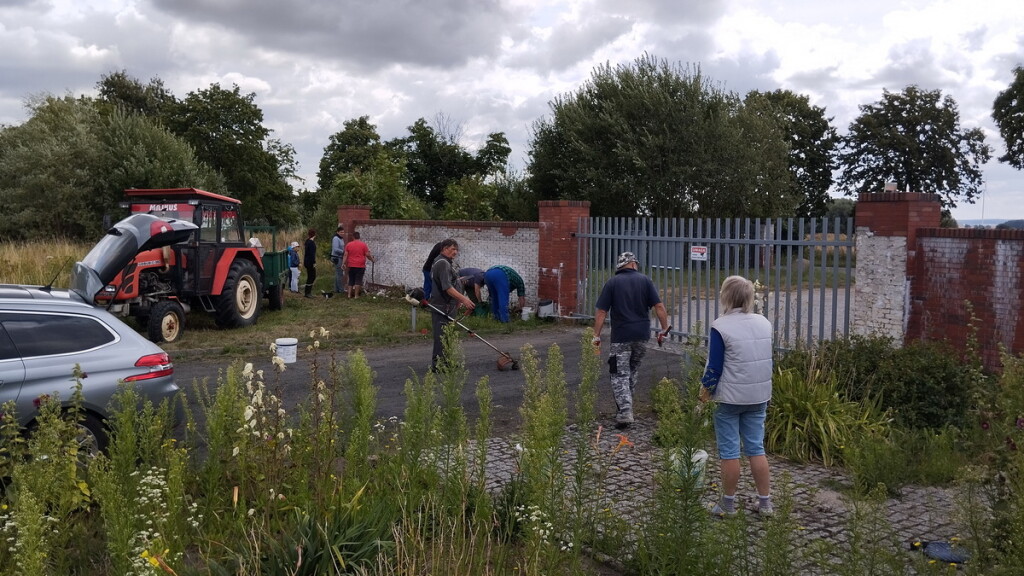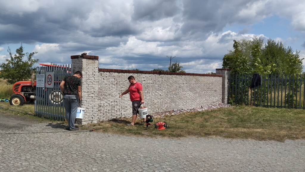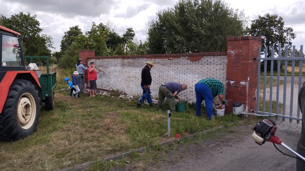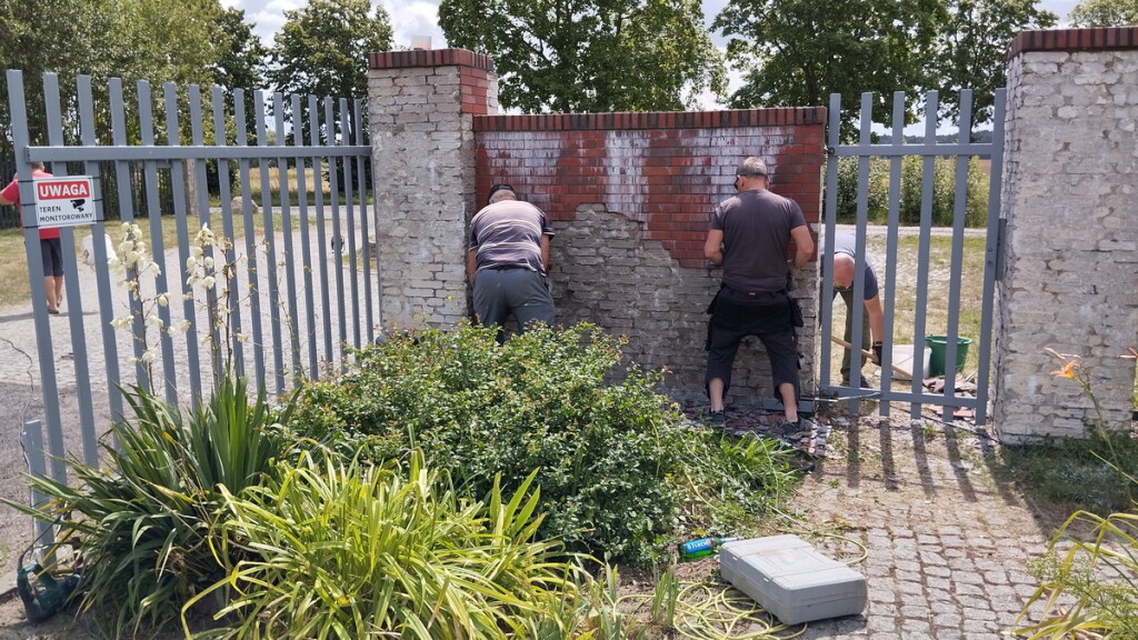 W dniu 22.07.23 zwołano w trybie pilnym, spontaniczne prace społeczne polegające na oczyszczeniu muru przy wjeździe na osiedle z uszkodzonego materiału zewnętrznego – klinkieru. Panowie chętnie podjęli wyzwanie. W pracach również uczestniczyły dzieci, pomagając wynosić uszkodzony materiał.