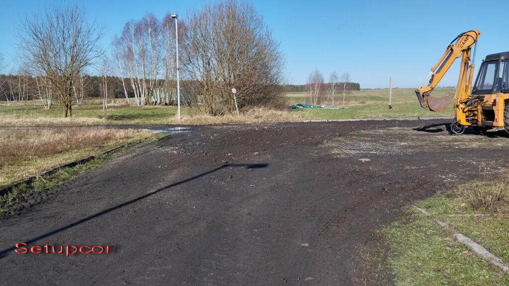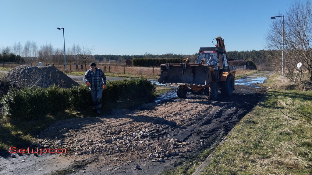 Pan Jan z własnych pieniędzy zakupił 20 T mielonego gruzu i 24.02.24 poprosił kolegów Marka i Bogdana o pomoc w wyrównaniu powstałych dziur z wykorzystaniem również żużlu pana Roberta na zakręcie przy parkingu i na drodze wewnętrznej przy swojej posesji. Z rozpędu została też wyrównana jedna duża dziura w drodze wewnętrznej do bramy.